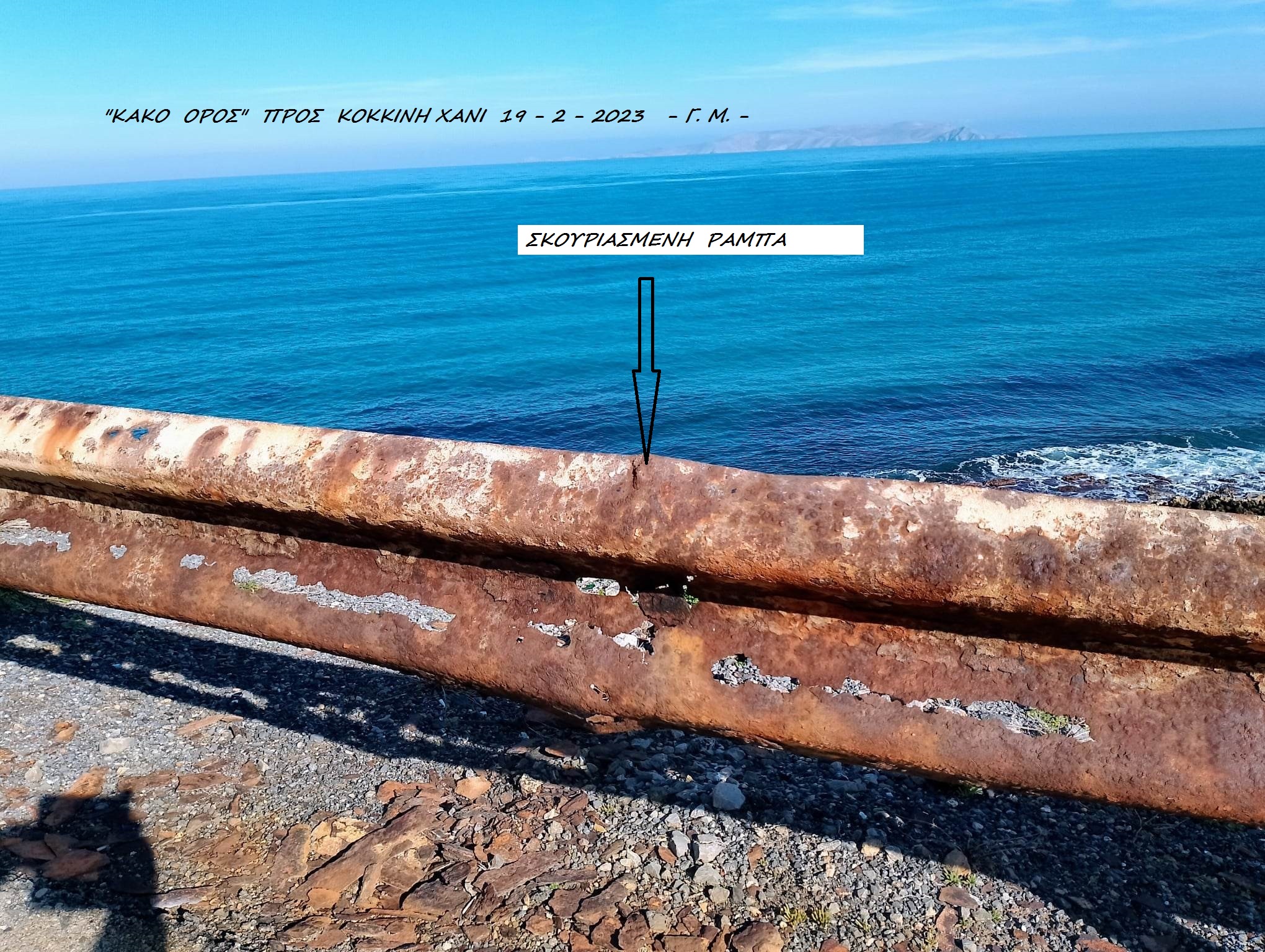 Η ανάρτηση αναφέρει: «Η παλαιά εθνική οδός από Ηράκλειο προς Κοκκίνη Χάνι, διέρχεται κατά μήκος της ακτής του βόρειου παραλιακού μετώπου της περιοχής, περνώντας από το “Κακό όρος” με τη μαγευτική θέα προς τη θάλασσα και τις απόκρημνες βραχώδεις στροφές που δημιουργεί η μορφολογία του εδάφους.