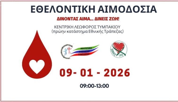 Κάλεσμα αλληλεγγύης απευθύνει ο Πολιτιστικός Σύλλογος Τυμπακίου, ο οποίος διοργανώνει εθελοντική αιμοδοσία την Παρασκευή 9 Ιανουαρίου 2026 στο Τυμπάκι.