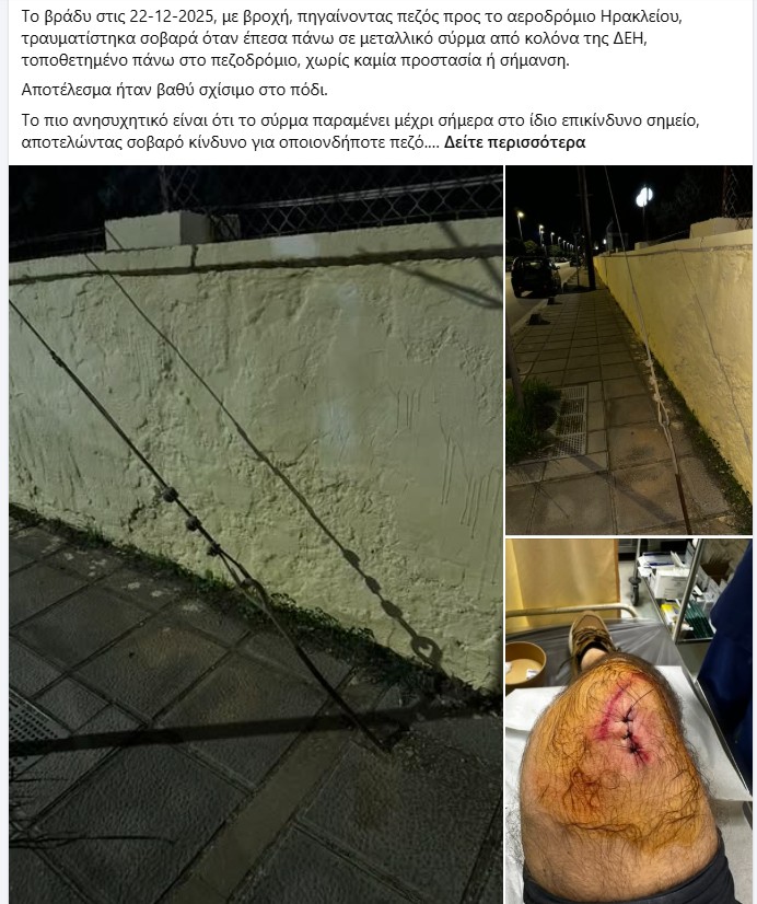 Το συμβάν σημειώθηκε το βράδυ της 22ας Δεκεμβρίου 2025, όταν ο άνδρας κινούνταν πεζός, υπό βροχόπτωση, προς το Αεροδρόμιο Ηρακλείου Νίκος Καζαντζάκης. Όπως περιγράφει, χωρίς να έχει καμία ορατή προειδοποίηση ή προστασία, προσέκρουσε σε μεταλλικό σύρμα που φέρεται να προεξέχει από κολόνα της ΔΕΗ, με αποτέλεσμα να υποστεί βαθύ τραύμα στο πόδι.