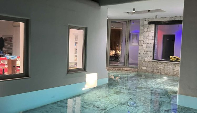 Πισίνα υπερχείλισης 50 τ.μ. με 3 επίπεδα βάθους, 2 υδρομασάζ και βυθό από πέτρα θαλάσσης