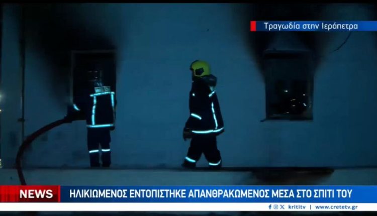 Τραγωδία σημειώθηκε τα ξημερώματα στην Ιεράπετρα, με θύμα έναν 70χρονο άνδρα ,,που βρέθηκε νεκρός μετά από φωτιά στο σπίτι του. Το περιστατικό συνέβη στον επαρχιακό δρόμο προς Μακρυλιά, με την οικογένεια του θύματος να ζει στιγμές οδύνης. Στο μικροσκόπιο της Πυροσβεστικής βρίσκονται τα ακριβή αίτια της πυρκαγιάς, με τις αρχές να εξετάζουν σοβαρά το ενδεχόμενο η φωτιά να προκλήθηκε από αναμμένο τσιγάρο.