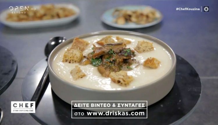 Ο Βαγγέλης Δρίσκας ετοιμάζει το πρώτο πιάτο, είναι μία απίθανη σούπα βελουτέ φασολιών με βασιλομανίταρα.