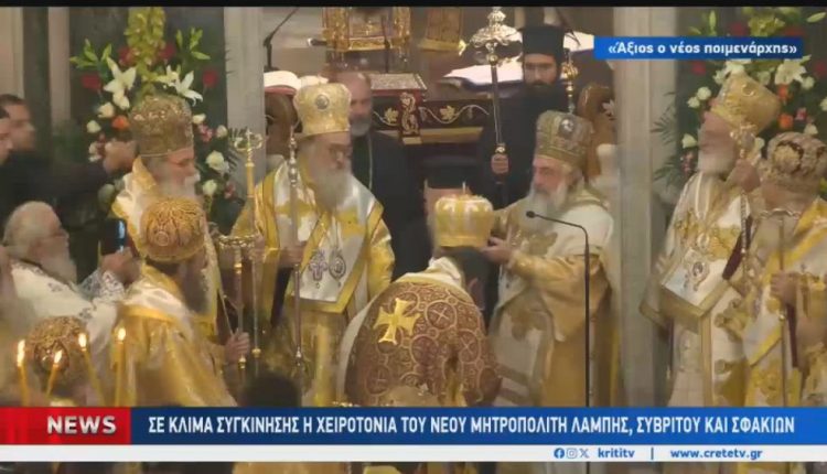 Σε κλίμα βαθιάς κατάνυξης τελέστηκε σήμερα στον Άγιο Μηνά η χειροτονία του νέου Μητροπολίτη Λάμπης, Συβρίτου και Σφακίων. Έρχομαι να γίνω ένα με εσάς ήταν το μήνυμα του νέου Μητροπολίτη προς το ποίμνιό του σε μία ομιλία-καταθεση ψυχής. Εμφανώς φορτισμένος αναφέρθηκε και στον προκάτοχο του Ειρηναίο η παρουσία του οποίου συγκίνησε.