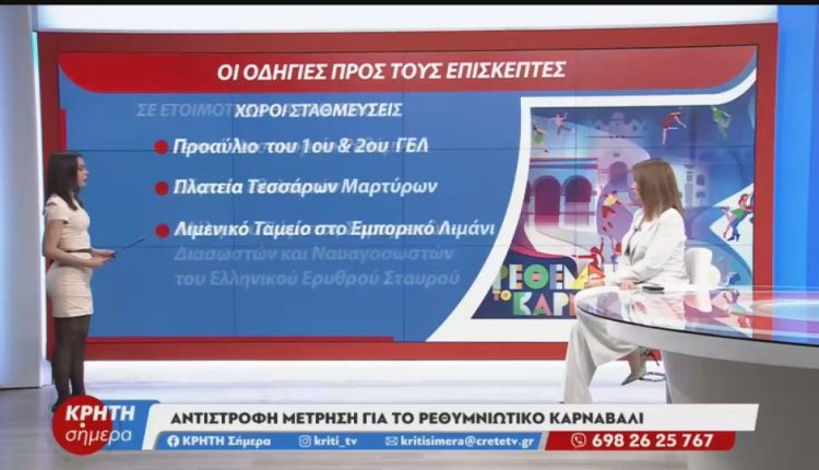 Η ΚΡΗΤΗ TV θα μεταδώσει ζωντανά τη μεγάλη καρναβαλική παρέλαση με παρουσιάστρια τη Χριαστιάνα Σκούρα, ενώ αποκλειστικός τηλεοπτικός χορηγός επικοινωνίας είναι η ΑΝΕΚ LINES, μέλος της Attica Group.