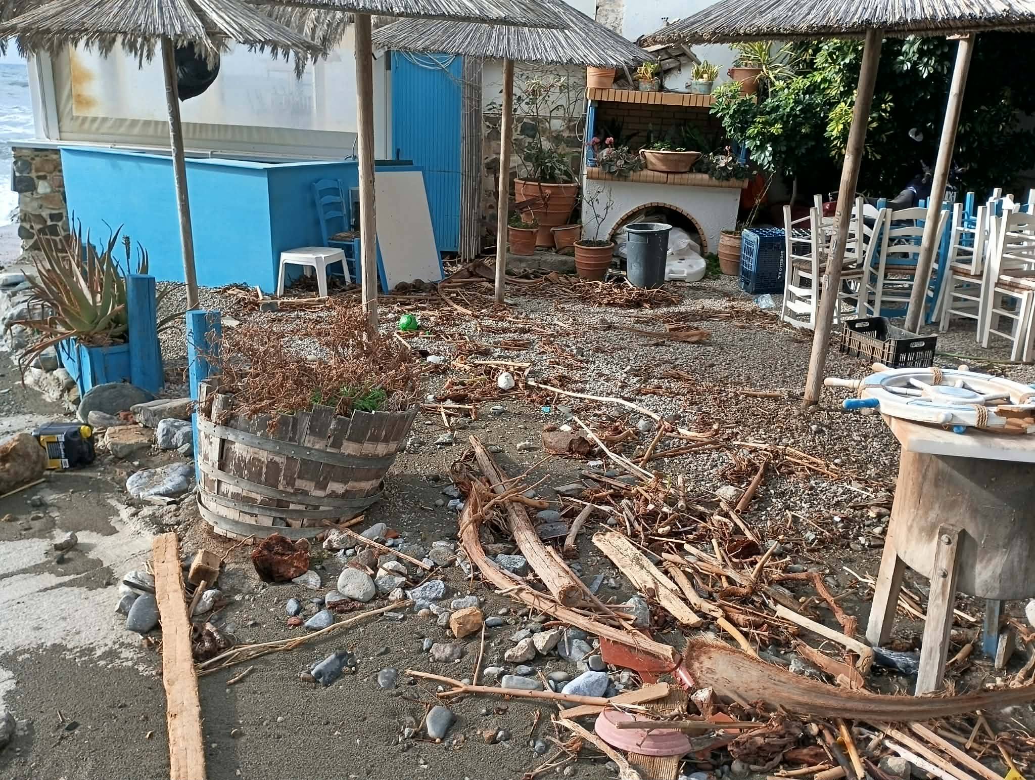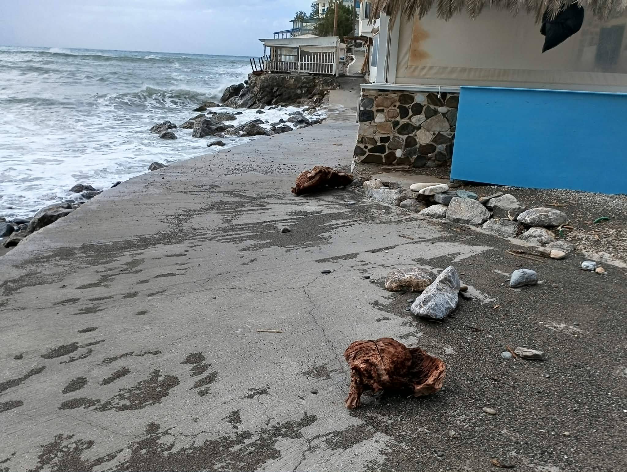Τα κύματα κάλυψαν υπαίθριους χώρους και εισχώρησαν στο εσωτερικό καταστημάτων, παρασύροντας εξοπλισμό και αντικείμενα, ενώ μεγάλες ποσότητες από άμμο και φερτά υλικά κατέληξαν σε αυλές και κοινόχρηστους χώρους.